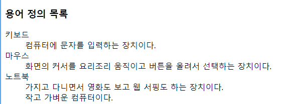 <dl>태그는 definition list(정의 목록)의 약자로, 사전처럼 용어를 설명하는 목록을 만듦.