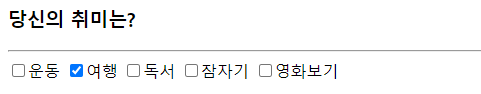 <input type="checkbox" name="hobby" value="여행" checked>여행