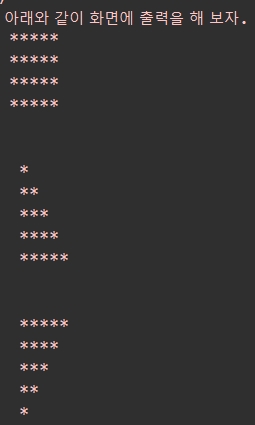 이런식으로 반복하면 아래로 갈수록 별이 한개씩 증가하는 결과창이 나온다.