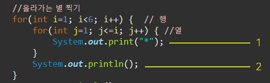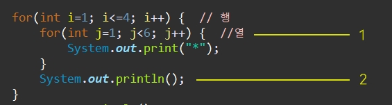 다음으로 두번째 반복 실행문인 줄바꿈(System.out.println();)(2)을 통해 열이 바뀌게 된다.