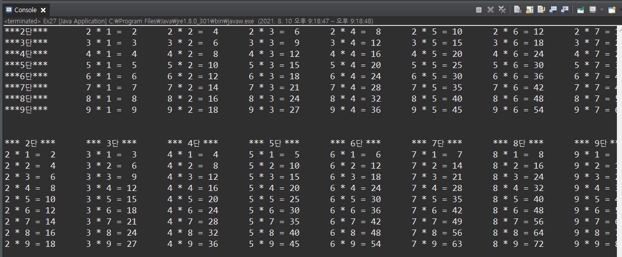 // 출력 형태 ex 2*1=2, 2*2=4 ...