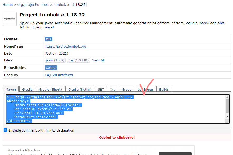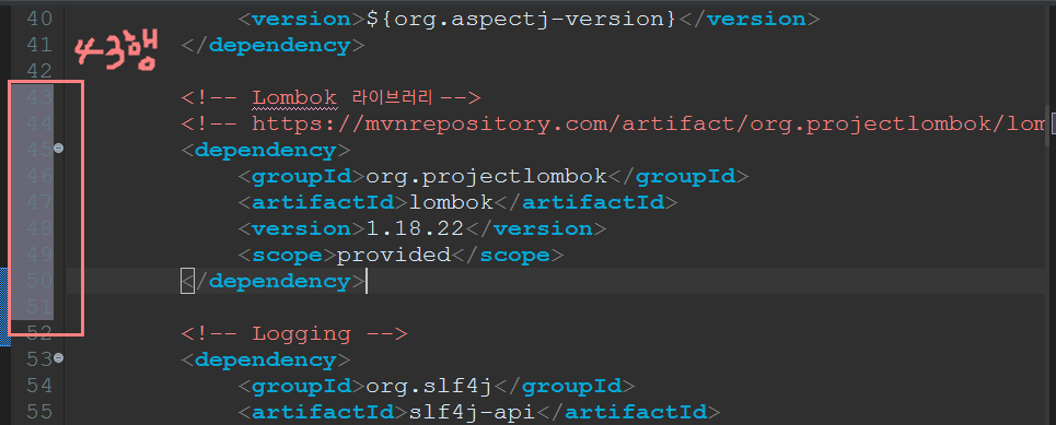 6. 43행 부근(또는 어디에나) 복사했던 라이브러리 붙여넣기( Lombok 라이브러리 추가 )