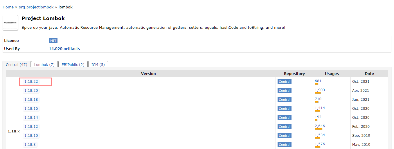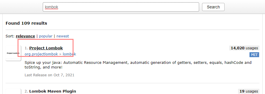 1. 사이트 접속 후 검색창에 'lombok' 입력 후 검색