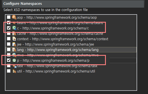 (c는 constructor-arg 태그의 약자, p는 property 태그의 약자)