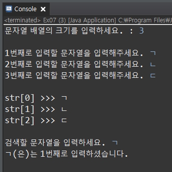 System.out.printf("%s(은)는 %d번째로 입력하셨습니다.",search,(i+1));