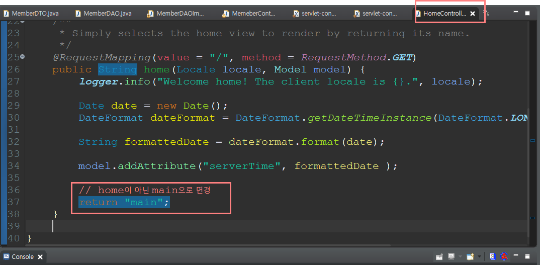 HomeController에서 return "home" > "main"으로 변경