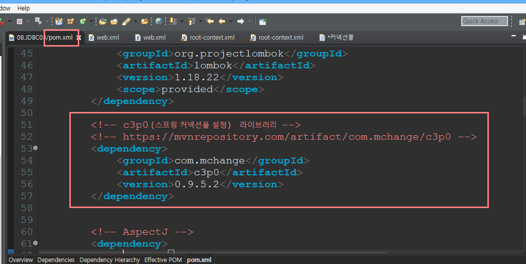 -pom.xml 파일에 c3p0 라이브러리를 추가해준다.