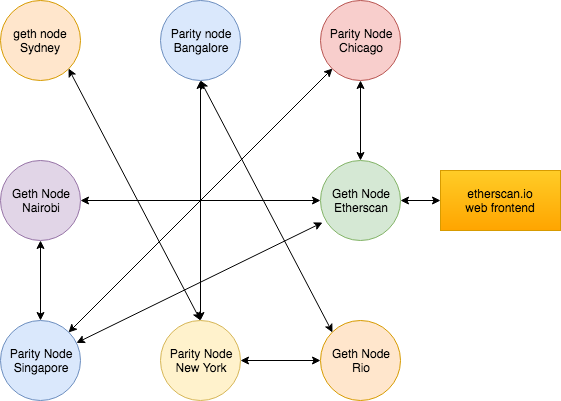 위 그림은 이더리움 네트워크를 시각화한 것으로 네트워크 내에서 이더스캔의 위치를 볼 수 있습니다.