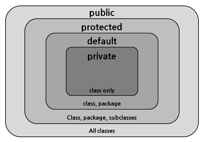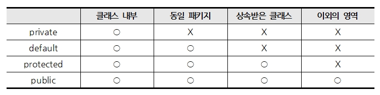public > protected > defaulf > private (클래스, 메서드, 변수 앞에 사용됨)
