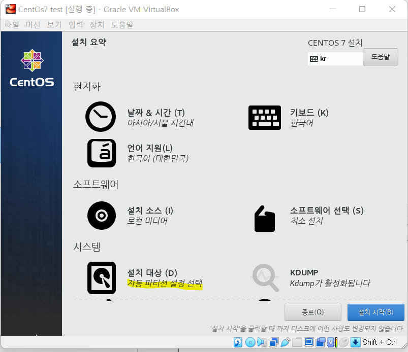 시스템은 자동 파티션 설정으로 선택하고 설치 시작한다