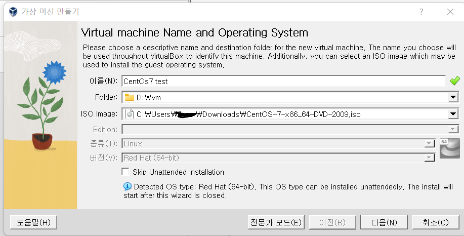 그 외의 가상머신 이름등을 설정하고 다음을 클릭하면