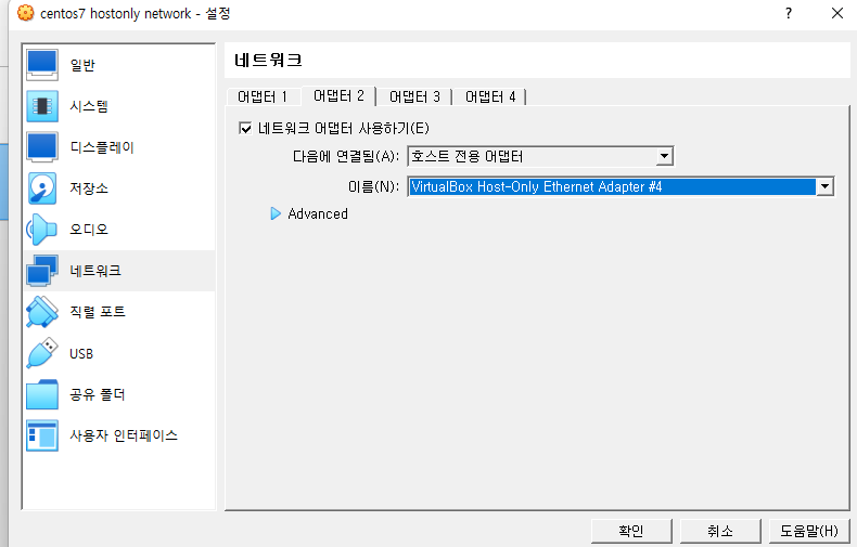 호스트 전용 어댑터를 선택해주고 아까 추가한 네트워크로 설정한다.