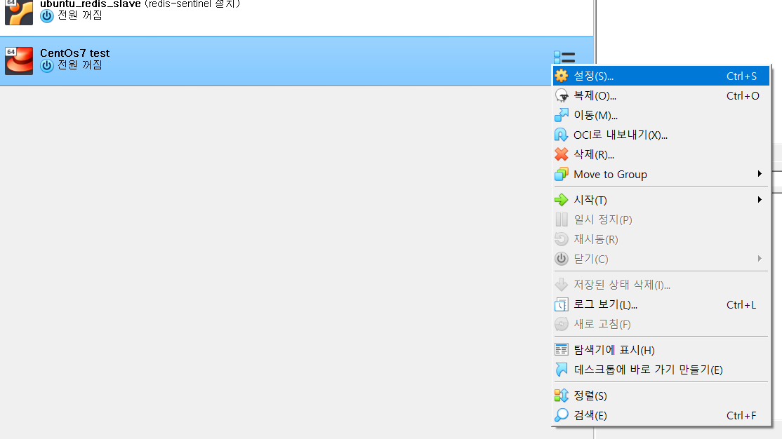 다시, vm 목록으로 돌아가서 우클릭 > 설정 > 네트워크