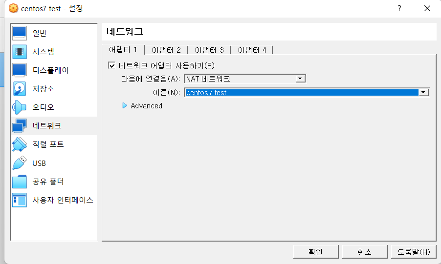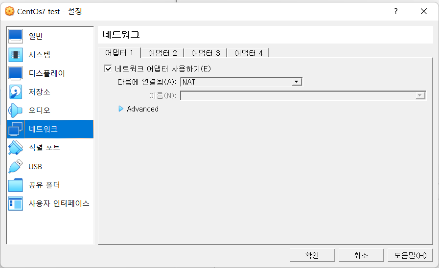 보면 기본으로 어댑터1에 NAT로 잡혀있는 것을 볼 수 있다.