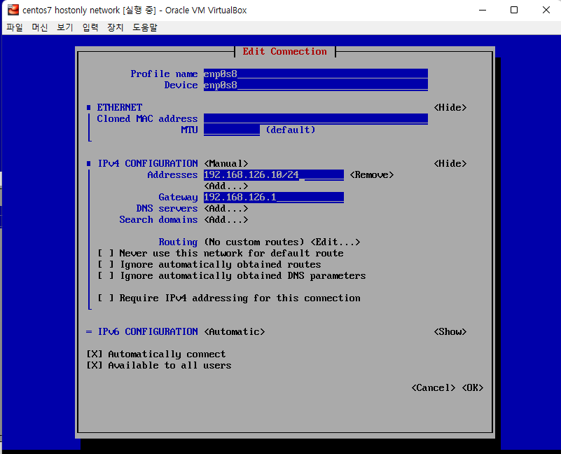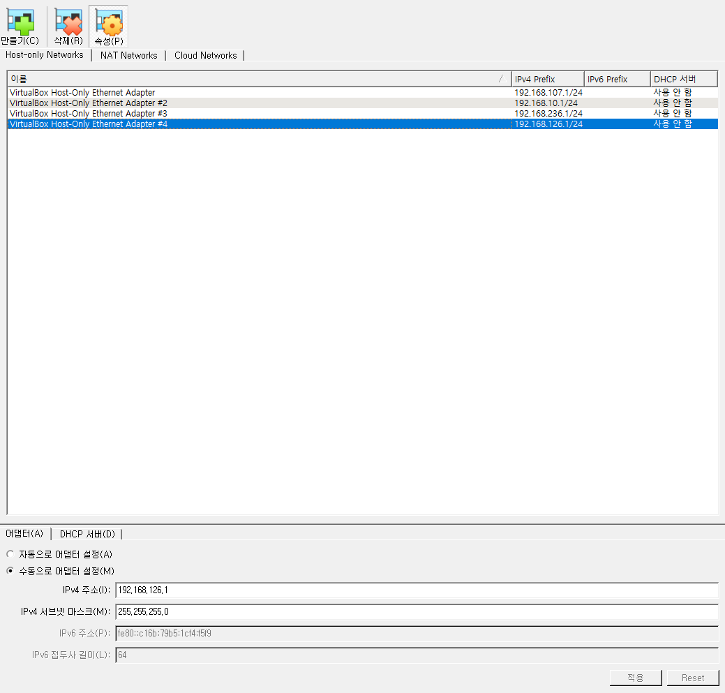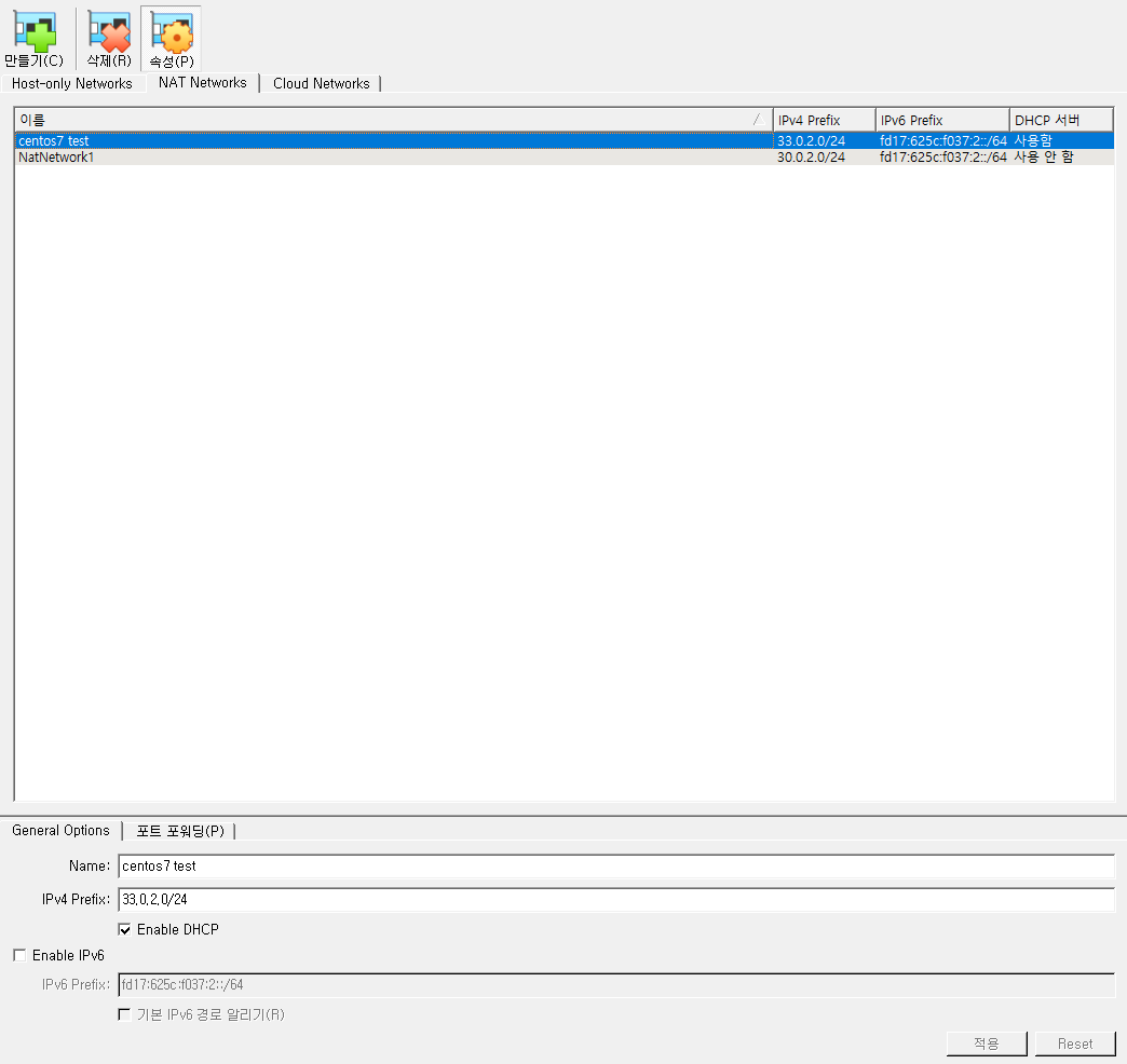 DHCP enable에 체크되어있는게 default인데, 이건 vm에서 자동으로 host를 부여한다는 뜻이다.