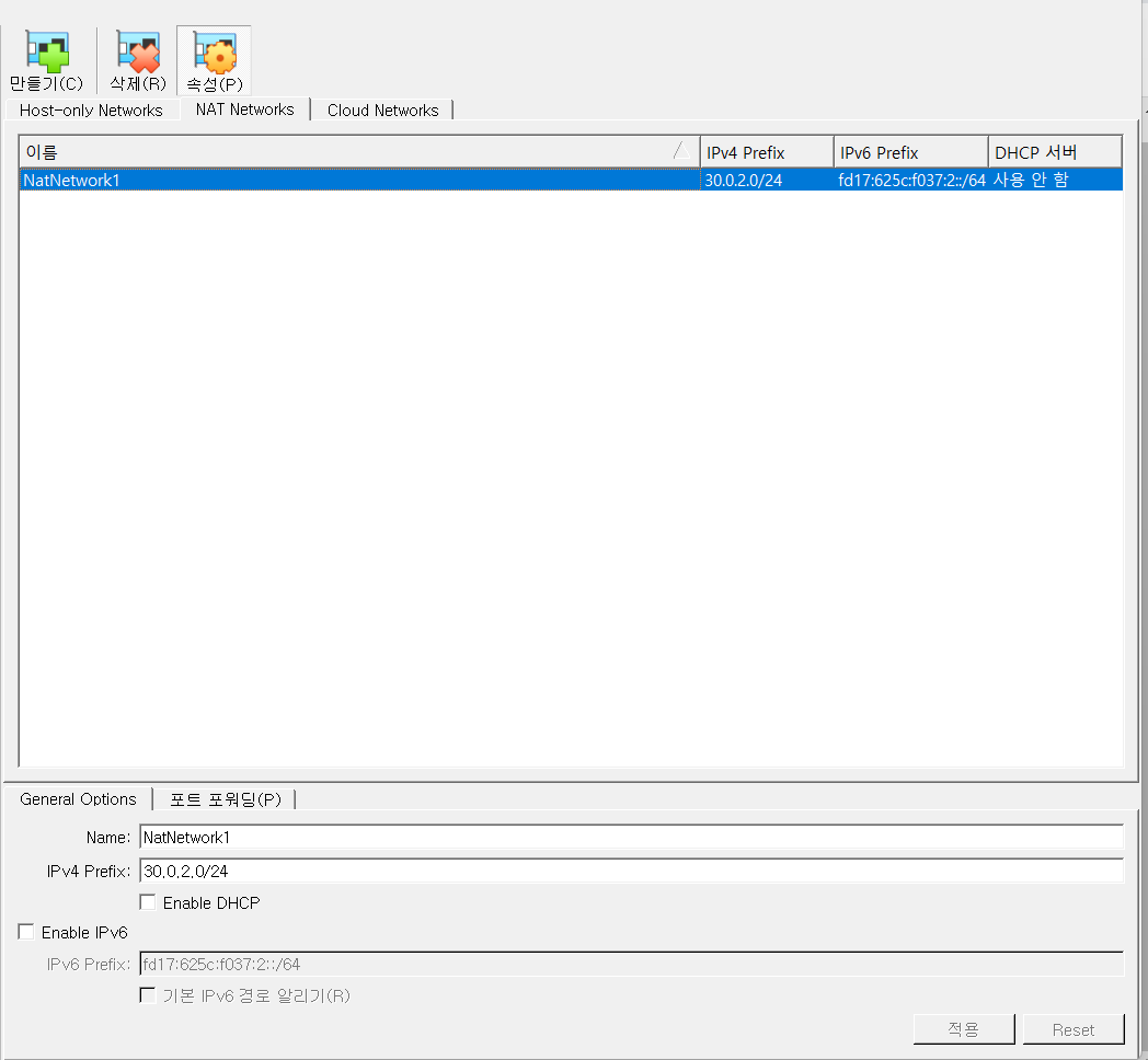 nat 네트워크의 이름을 클릭하면 아까 추가한 네트워크가 뜨는 걸 볼 수 있고, 이를 선택한다.