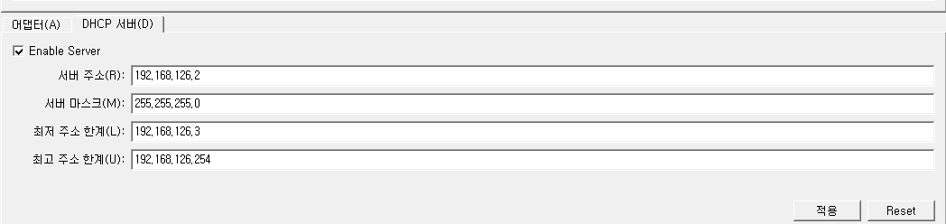 하단에 DHCP 서버 탭을 클릭하여 enable server 체크박스를 선택한다.