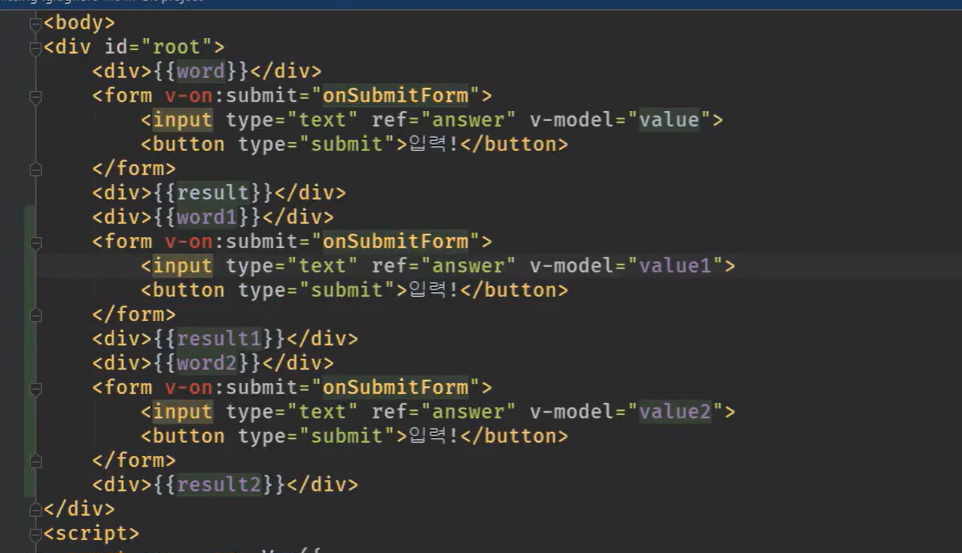 <script> Vue.component('wordRelay', { template: ` <div> <div>{{ word }}</div> <form v-on:submit="onSubmitForm"> <input type="text" v-model="value" ref="answer"> <button type="submit">입력!</button> </form> <div>{{ result }}</div> </div> `, data() { return { word: '진진자라', result: '', value: '', } }, methods: { onSubmitForm(e) { e.preventDefault(); if (this.word[this.word.length - 1] === this.value[0]) { this.result = '딩동댕'; this.word = this.value; } else { this.result = '땡'; } this.value = ''; this.$refs.answer.focus(); } } }); </script> <script> const app = new Vue({ el: '#root', }); </script>이런 구조를 가진 것이 vue 컴포넌트