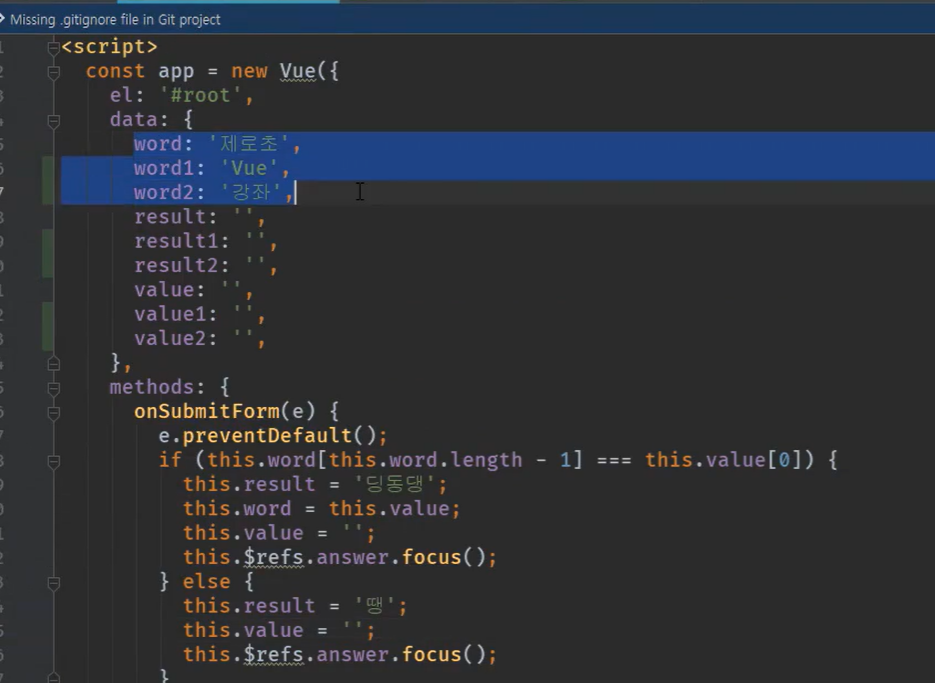 <script> Vue.component('wordRelay', { template: ` <div> <div>{{ word }}</div> <form v-on:submit="onSubmitForm"> <input type="text" v-model="value" ref="answer"> <button type="submit">입력!</button> </form> <div>{{ result }}</div> </div> `, data() { return { word: '진진자라', result: '', value: '', } }, methods: { onSubmitForm(e) { e.preventDefault(); if (this.word[this.word.length - 1] === this.value[0]) { this.result = '딩동댕'; this.word = this.value; } else { this.result = '땡'; } this.value = ''; this.$refs.answer.focus(); } } }); </script> <script> const app = new Vue({ el: '#root', }); </script>