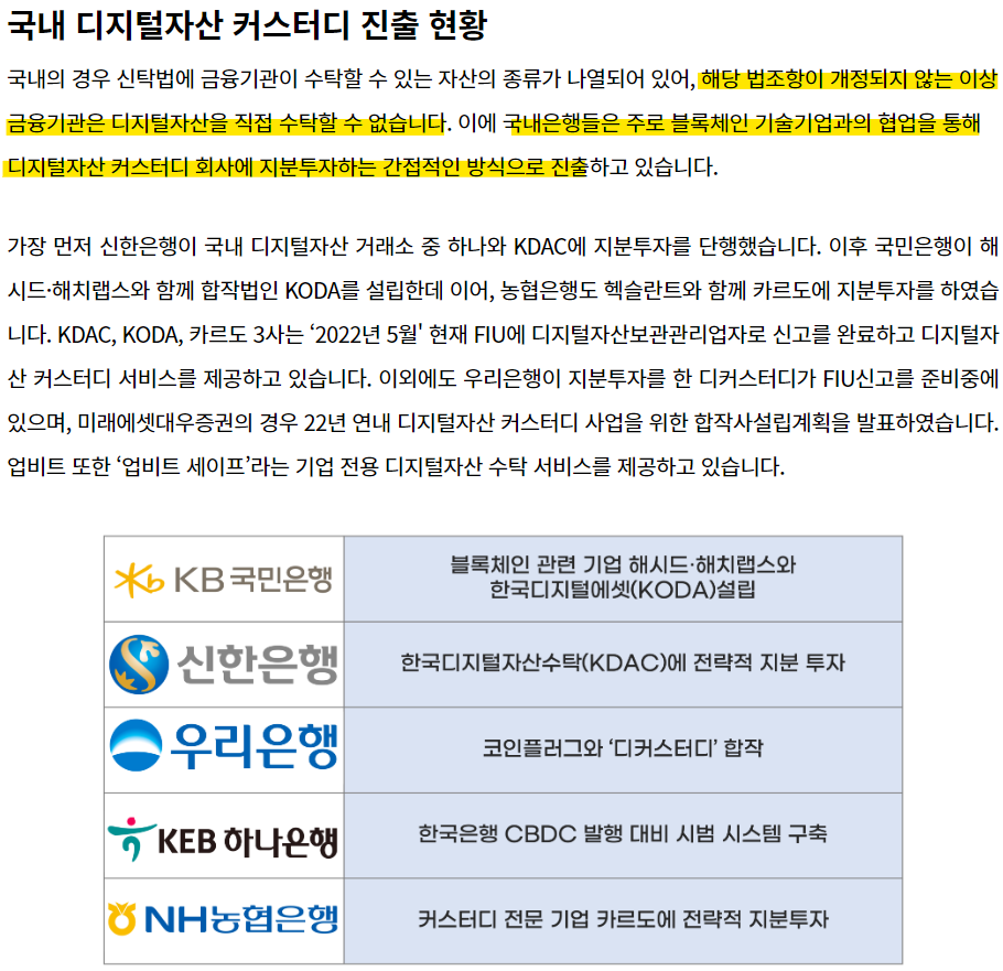 KB국민은행, 신한은행, 우리은행 등 시중은행들은 블록체인 기업과 제휴를 맺거나 합작법인을 설립하고 커스터디 사업에 진출을 추진하고 있다.