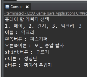 System.out.println("플레이할 캐릭터 선택(1.메이 / 2.겐지 / 3.맥크리)");