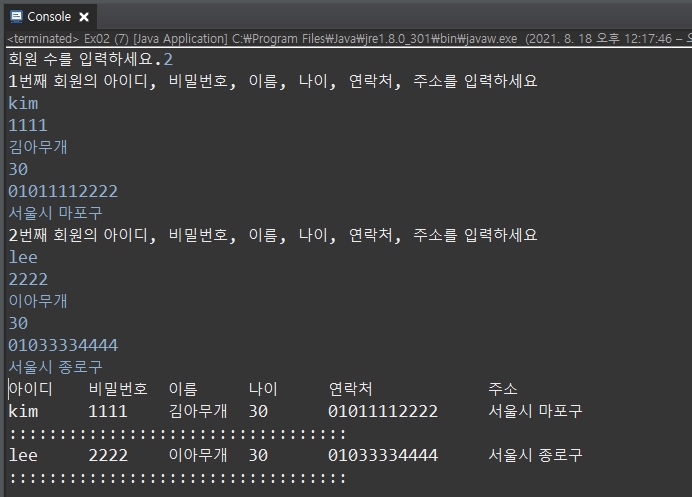 System.out.printf("%d번째 회원의 아이디, 비밀번호, 이름, 나이, 연락처, 주소를 입력하세요\n", (i+1));