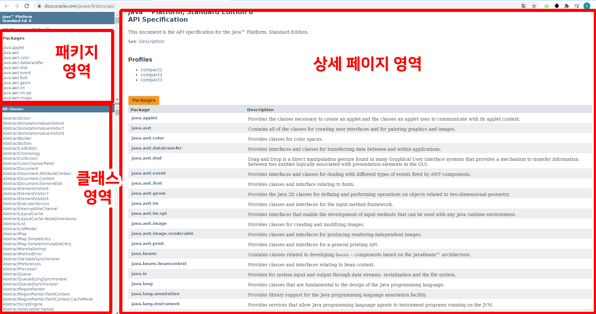 - API 문서들을 모아 놓은 곳 : http://docs.oracle.com/javase/8/docs/api/