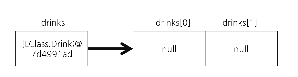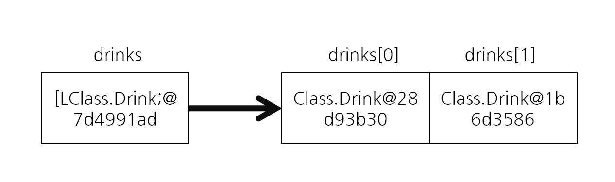 System.out.println("객체(drinks)의 주소 : " + drinks); // 객체의 주소가 저장됨을 볼 수 있음