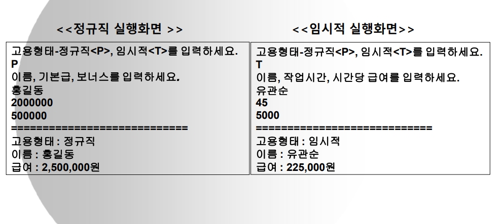 System.out.println("고용형태 - 정규직<P>, 임시직<T>를 입력하세요. ");