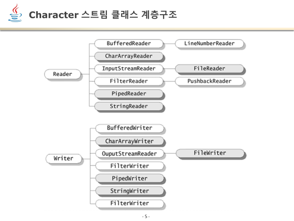 - 2바이트 단위로 파일을 처리하는 문자 기반 입출력 스트림
