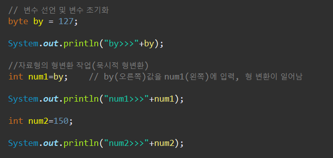 이 때 num2앞에 (byte)를 붙여주면 명시적 형변환이 일어난다.