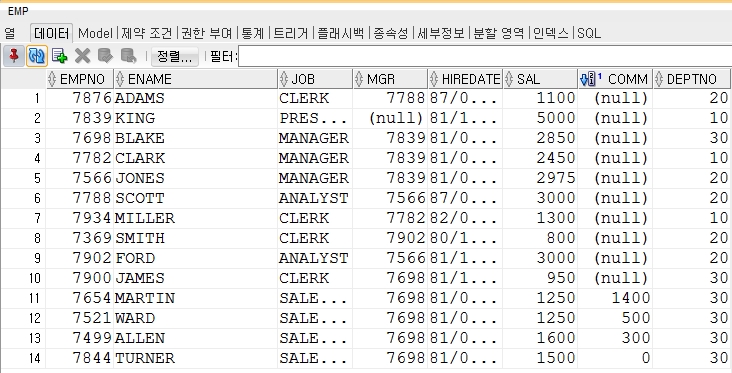 EMP 테이블과 그의 데이터를 아래와 같이 생성하고,