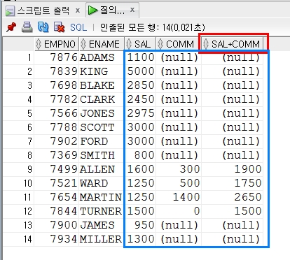 SELECT empno, ename, sal, comm, sal+comm FROM emp;