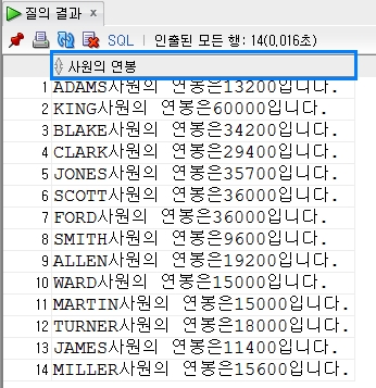 -- 예) KING 사원의 연봉은 60000 입니다.