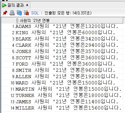 select ename || q'[ 사원의 '21년 연봉은]' || sal *12 || '입니다.' as "사원의 '21년 연봉" from emp;