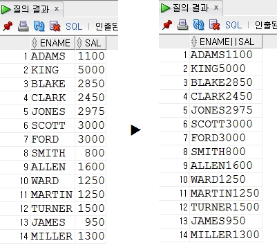 연결 연산자 ( || ) 양쪽의 열이 결합되어 단일 열을 출력한다.