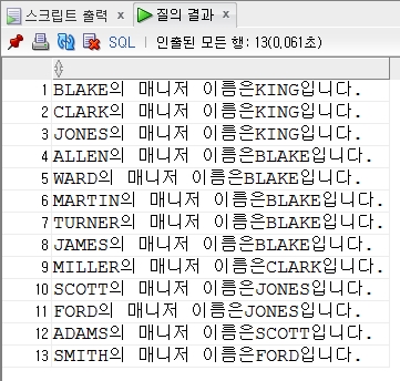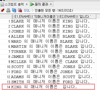 SELECT e1.ename || ' 의 매니저 이름은 ' || e2.ename || ' 입니다.'