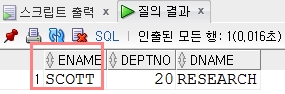-- emp 테이블에서 사원이 "SCOTT"인 사원의 부서명을 화면에 보여주세요