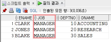 where job='MANAGER'; --job은 emp 테이블에만 있으므로 따로 테이블명을 기재하지 않음