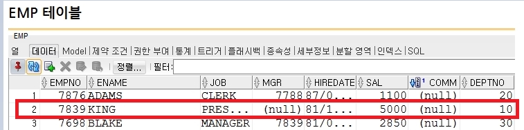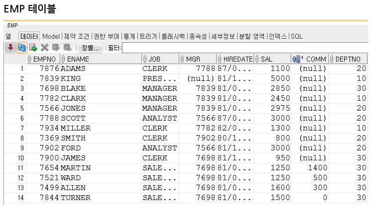 하지만, emp테이블의 데이터 갯수는 14개인데 하나가 빠져있는 것을 볼 수 있다.
