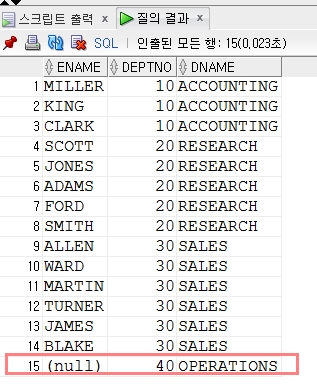 on e.deptno(+) = d.deptno -- 부서번호 40번 데이터가 없으므로