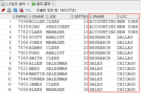 on e.deptno = d.deptno; -- 일치되는 공통 컬럼(=deptno), 컬럼명 앞에 테이블명(e/d)을 기술