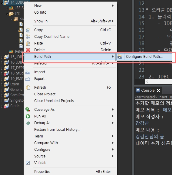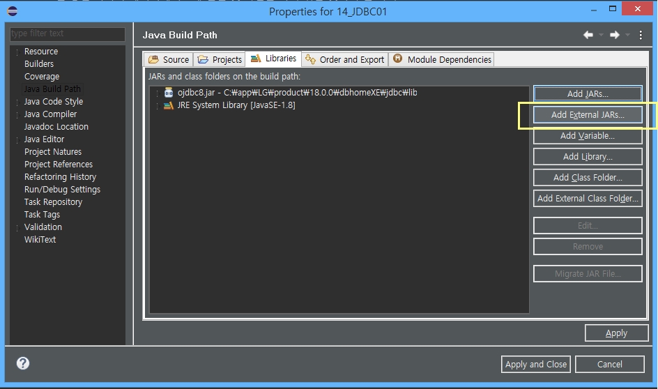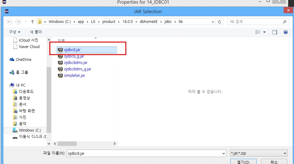 - 오라클 드라이버 파일(C:\app\컴퓨터이름\product\18.0\dbhomeXE\jdbc\lib) 폴더 안에 있는 ojdbc8.jar 파일을 프로젝트에 포함시켜 주면 됨