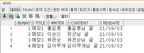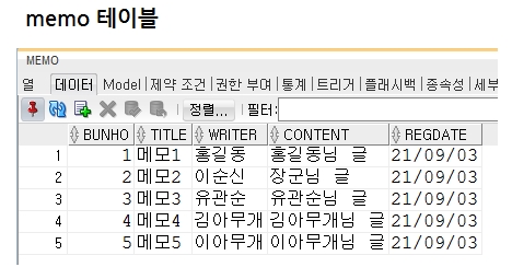 오라클에서 확인하면 이렇게 5번 메모가 삭제된 것을 볼 수 있다.