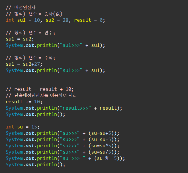 - 단축배정연산자 : 배정연산자를 간편하게 사용하는 연산자.