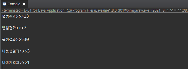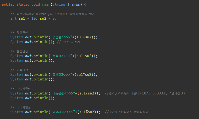 - 덧셈(+), 뺄셈(-), 곱셈(*), 나눗셈(/), 나머지(%)