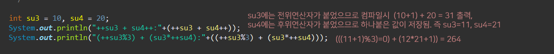 * 후위연산자 : 단항연산자가 변수명 뒤에 온다.(ex. su4++ or su4--)