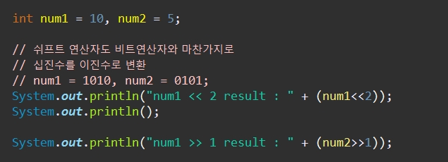 - 비트를 대상으로 왼쪽 / 오른쪽으로 비트를 밀어서 연산을 수행하는 연산자.