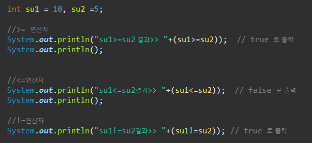 - 관계 연산자는 제어문(조건문)에서 많이 사용되는 연산자.