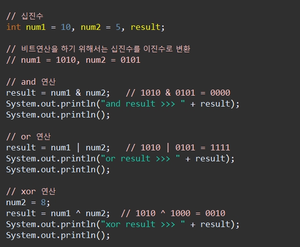 - &(and) : 두 비트의 조건이 참(1)인 경우 1을 반환, 그 외에는 0을 반환.